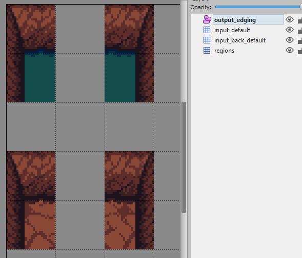 The second suggestion will probably not work, considering I’m going to have countless different tiles that could be placed next to the wall. In the example I only used blueish grass and dirt, but I’ll also add other colors of grass, maybe gravel, sand etc. etc. As my tileset’s size increases, it would slowly become a very tedious and unmaintainable job to have to change every previous rule as well, instead of just having to set the new one.